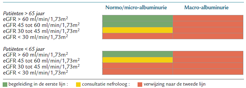 Figuur 1: Indicaties voor beleid in de eerste lijn, tweede lijn en consultatie van een nefroloog