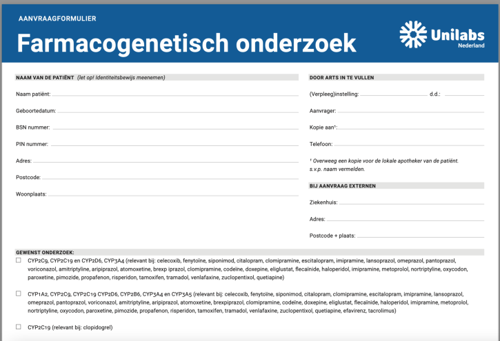 Bij Unilabs NL wordt dit zogenaamde farmacogenetisch onderzoek ook uitgevoerd: Het basis farmacogenetisch pakket omvat CYP2D6, CYP2C19, CYP2C9 en CYP3A4 via welke de meeste medicijnen worden gemetaboliseerd. Een uitgebreider pakket bevat naast bovenstaande testen ook CYP2B6, CYP1A2 en CYP3A5. En bij clopidogrel gebruik is een losse CYP2C19 analyse mogelijk. Andere analyses vraagt u aan via CYP overig. Op afzienbare termijn zal de analyse verder uitgebreid worden en zal analyse via wangslijmvlies mogelijk worden. Aangezien het genetisch onderzoek betreft, hoeft dit onderzoek slechts eenmalig uitgevoerd te worden. De rapportage vermeldt de afwijkingen per CYP en wat het effect is op de metabole activiteit van het enzym. Uw lokale apotheker zal op basis van de uitslagen van het onderzoek waar nodig de dosering van het medicijn aanpassen.