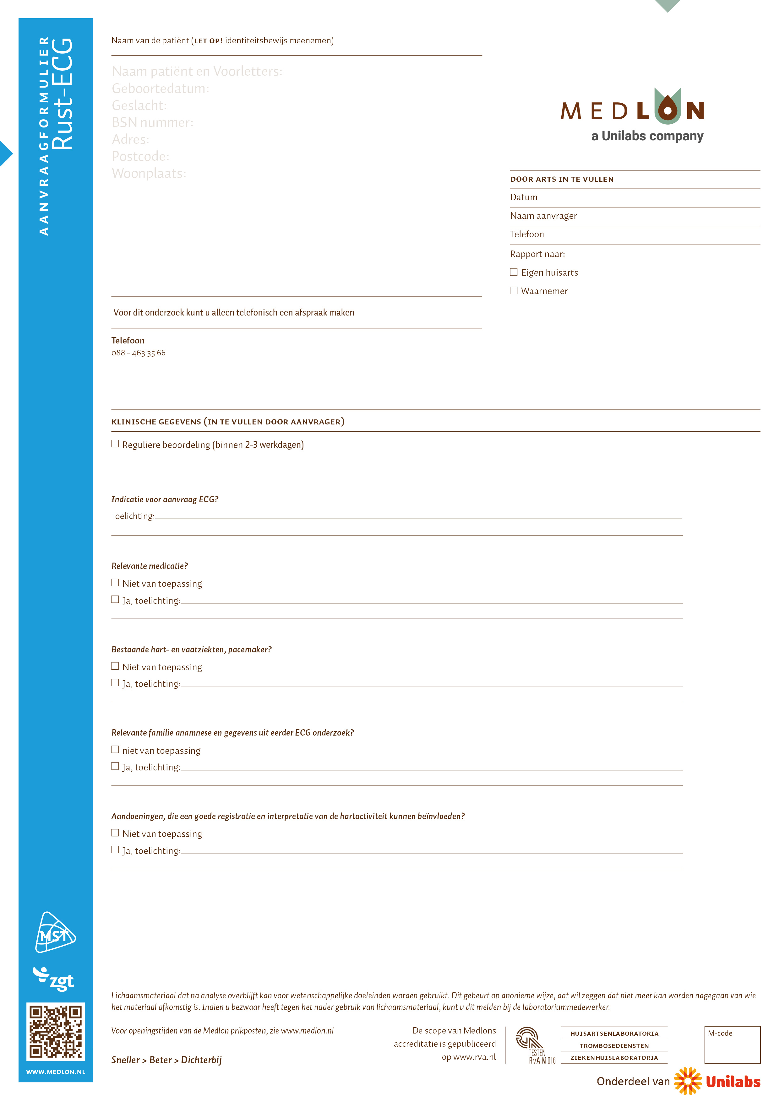 Voor het aanvragen van rust-ECG's kunnen huisartsen het aanvraagformulier downloaden. Met dit ingevulde aanvraagformulier kunnen patiënten op werkdagen tussen 08.00 - 16.00 uur alleen op afspraak worden geholpen op onze locaties bloedafname in ZGT Hengelo (route 0.3). Een afspraak kan gemaakt worden via 088 - 463 35 66.
