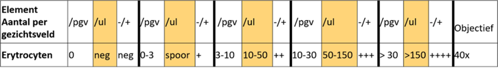 In de richtlijn hematurie van de Nederlands Vereniging Urologie wordt gesproken over erytrocyten per gezichtsveld terwijl rapportage van het aantal erytrocyten veelal in plusjes of aantallen per µl worden uitgedrukt. Onderstaande tabel laat zien hoe de diverse uitslagen met elkaar zijn gecorreleerd.